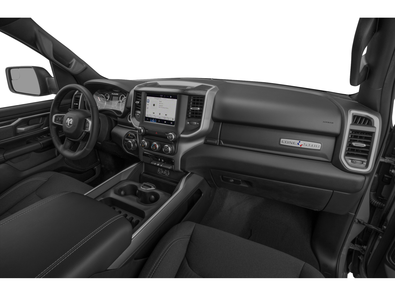This 2022 Ram 1500 Big Horn/Lone Star in Billet Silver Metallic Clearcoat has the following : Big Horn Level 1 Equipment Group (2nd Row In Floor Storage Bins, 4G LTE Wi-Fi Hot Spot, 8.4 Touchscreen Display, Apple CarPlay, Auto-Dimming Exterior Driver Mirror, Auto-Dimming Rear-View Mirror, Black Exterior Mirrors, Black Premium Power Mirrors, Bluetooth® Handsfree Phone & Audio, Class IV Receiver Hitch, Cluster 3.5 TFT Color Display, Connectivity - US/Canada, Convex Wide-Angle Mirror Insert, Exterior Mirrors Courtesy Lamps, Exterior Mirrors w/Heating Element, Exterior Mirrors w/Supplemental Signals, For Details, Visit DriveUconnect.com, Global Telematics Box Module (TBM), Glove Box Lamp, Google Android Auto, GPS Antenna Input, Integrated Center Stack Radio, Power 2-Way Driver Lumbar Adjust, Power 8-Way Driver Seat, Power Adjustable Pedals, Power-Folding Mirrors, Radio: Uconnect 5 W w/8.4 Display, Rear Dome w/On/Off Switch Lamp, Rear Power Sliding Window, Rear Window Defroster, SiriusXM Radio Service, SiriusXM Satellite Radio, Sun Visors w/Illuminated Vanity Mirrors, Universal Garage Door Opener, and USB Host Flip), Quick Order Package 27R Lone Star (Regional) (Lone Star Badge), Sport Appearance Package (3 Rear Seat Head Restraints, 4 Way Front Headrests, All Plant-Installed Decals, Black Interior Accents, Body Color Exterior Mirrors, Body Color Front Bumper, Body Color Premium Power Mirrors, Body Color Rear Bumper w/Step Pads, Bridgestone Brand Tires, Bucket Seats, Delete LED Lamp - Floor Console Bin, Deluxe Cloth Bucket Seats, Front Seat Back Map Pockets, Full Length Floor Console, Manual Adjust 4-Way Front Passenger Seat, Rear 60/40 Folding Seat, Rear Center Armrest, and Sport Decal), 3.21 Rear Axle Ratio, 4-Wheel Disc Brakes, 48V Belt Starter Generator, 6 Speakers, ABS brakes, Air Conditioning, Alloy wheels, AM/FM radio, Brake assist, Bumpers: chrome, Cloth Bench Seat, Cluster 7.0 TFT Color Display, Compass, Connected Services Delete Credit, Delay-off headlights, Driver door bin, Dual front impact airbags, Dual front side impact airbags, Electronic Stability Control, Emergency communication system: SiriusXM Guardian, Front anti-roll bar, Front Center Armrest w/Storage, Front fog lights, Front License Plate Bracket, Front reading lights, Front wheel independent suspension, Fully automatic headlights, Heated door mirrors, Heavy-Duty Engine Cooling, Illuminated entry, Integrated Voice Command w/Bluetooth®, Leather steering wheel, Low tire pressure warning, MOPAR Front & Rear Rubber Floor Mats, Occupant sensing airbag, Outside temperature display, Overhead airbag, Overhead console, Panic alarm, ParkView Rear Back-Up Camera, Passenger door bin, Passenger vanity mirror, Power door mirrors, Power steering, Power windows, Radio data system, Radio: Uconnect 3 w/5 Display, Rear anti-roll bar, Rear seat center armrest, Rear step bumper, Remote keyless entry, Remote Start System, Speed control, Split folding rear seat, Steering wheel mounted audio controls, Tachometer, Telescoping steering wheel, Tilt steering wheel, Traction control, Trailer Brake Control, Trip computer, Variably intermittent wipers, Voltmeter, Wheels: 18 x 8 Cast-Aluminum Painted, and Wheels: 20 x 9 Aluminum Chrome Clad (WRK)