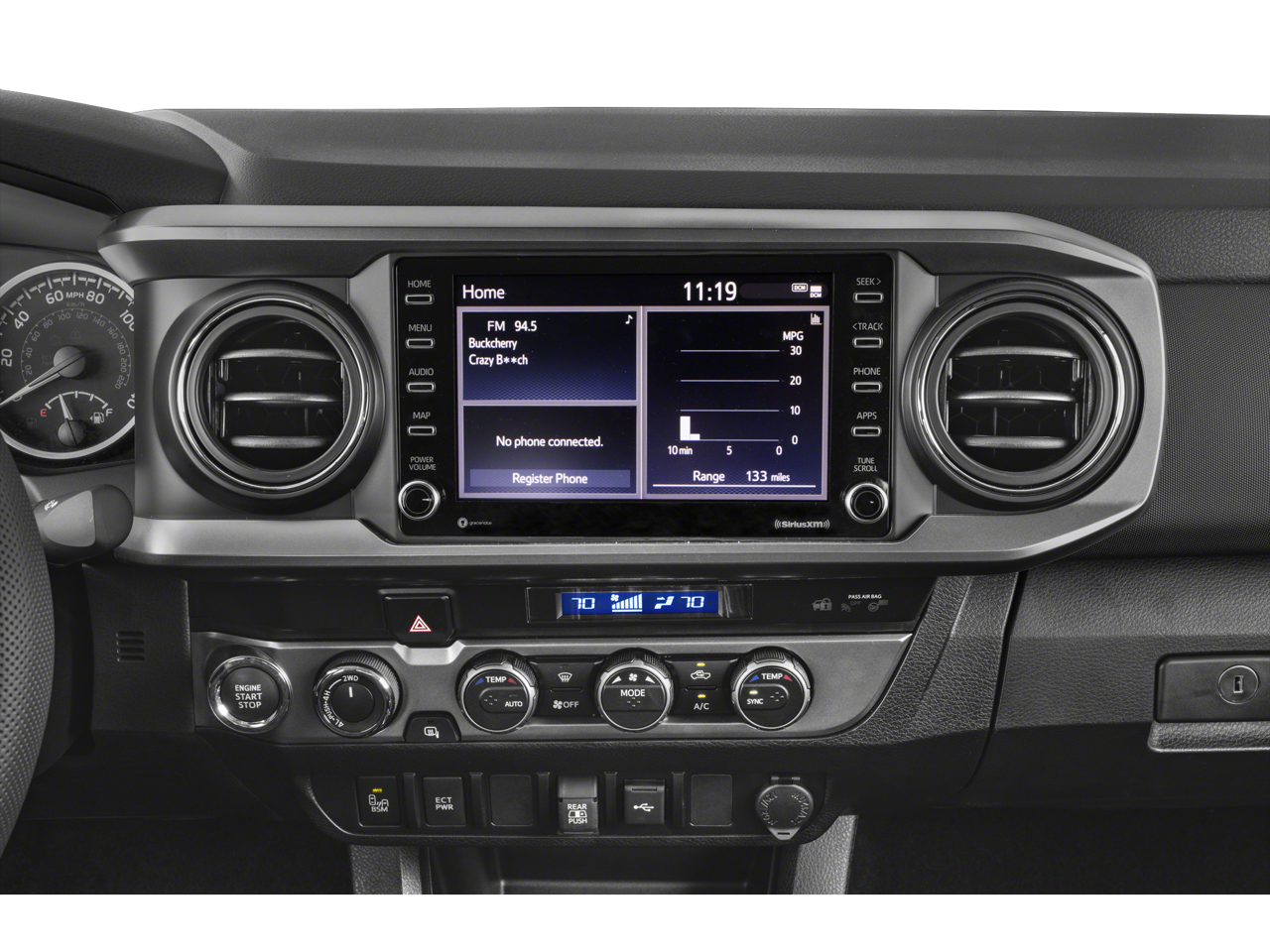 This 2023 Toyota Tacoma Trail Edition in Magnetic Gray Metallic has the following : 4WD Technology Package (Blind Spot Monitor w/Rear Cross Traffic Alert), Trail Edition (120V/400W Deck Mounted AC Power, Black Headlamp Bezel, Body Color Overfenders, Front Door Smart Key System w/Push Button Start, Heritage Grille, Leaf Trail Rear Suspension, and Power Sliding Rear Window w/Privacy Glass), 4WD, 6 Speakers, ABS brakes, Air Conditioning, Alloy wheels, AM/FM radio: SiriusXM, Anti-whiplash front head restraints, Apple CarPlay/Android Auto, Auto High-beam Headlights, Auto-Dimming Inside Rear-View Mirror, Auto-dimming Rear-View mirror, Automatic temperature control, Axle Ratio: 3.91, Brake assist, Bumpers: body-color, Driver door bin, Dual front impact airbags, Dual front side impact airbags, Electronic Stability Control, Emergency communication system: Safety Connect (1-year trial), Exterior Parking Camera Rear, Fabric Seat Trim, Front anti-roll bar, Front Bucket Seats, Front Center Armrest, Front dual zone A/C, Front fog lights, Front reading lights, Front Seats, Front wheel independent suspension, Heated door mirrors, Illuminated entry, Knee airbag, Low tire pressure warning, Occupant sensing airbag, Outside temperature display, Overhead airbag, Overhead console, Panic alarm, Passenger door bin, Power door mirrors, Power driver seat, Power steering, Power windows, Radio: Audio, Radio: Premium Audio w/Dynamic Navigation, Rear Parking Assist Sonar, Rear step bumper, Remote keyless entry, Speed control, Speed-sensing steering, Split folding rear seat, Steering wheel mounted audio controls, Tachometer, Telescoping steering wheel, Tilt steering wheel, Traction control, Trip computer, Variably intermittent wipers, and Wheels: 16 Bronze-Colored.