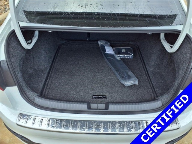 This 2025 Volkswagen Jetta 1.5T SE in Opalwhitepearl has the following : 4-Wheel Disc Brakes, 6 Speakers, ABS brakes, Active Blind Spot Monitor, Air Conditioning, Alloy wheels, AM/FM radio: SiriusXM with 360L, Auto-dimming Rear-View mirror, Auto-Dimming Rearview Mirror w/HomeLink Connect, Automatic temperature control, Brake assist, Bumperdillo Rear Bumper Protection Plate in Chrome, Bumpers: body-color, CloudTex & V-Tex Leatherette Seat Trim, Delay-off headlights, Driver door bin, Driver vanity mirror, Dual front impact airbags, Dual front side impact airbags, Electronic Stability Control, Emergency communication system: VW Car-Net Safe & Secure 5-year, Exterior Parking Camera Rear, First Aid Kit, Front anti-roll bar, Front Bucket Seats, Front Center Armrest, Front dual zone A/C, Front wheel independent suspension, Fully automatic headlights, Heated door mirrors, Heated Front Seats, Heated front seats, Heavy Duty Trunk Liner w/VW CarGo Blocks, Illuminated entry, Leather Shift Knob, Leather steering wheel, Low tire pressure warning, Occupant sensing airbag, Outside temperature display, Overhead airbag, Overhead console, Panic alarm, Passenger door bin, Passenger vanity mirror, Power door mirrors, Power driver seat, Power steering, Power windows, Radio data system, Radio: MIB3 Composition Media w/8 Touchscreen, Rain sensing wipers, Rear anti-roll bar, Rear reading lights, Rear seat center armrest, Rear window defroster, Remote keyless entry, Rubber Monster Mats Kit (Set of 4), Speed control, Speed-sensing steering, Split folding rear seat, Steering wheel mounted audio controls, Tachometer, Telescoping steering wheel, Tilt steering wheel, Traction control, Trip computer, Variably intermittent wipers, VW Care, and Wheels: 17 Twin 5-Spoke 2-Tone Machined Alloy.